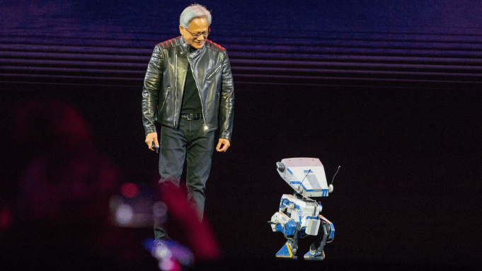 Jensen Huang looking at a fully autonomous Robot powered by the latest Nvidia technology.