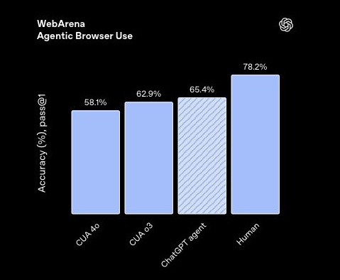 Its abilities extend to browsing and interacting with websites as well. On the WebArena benchmark, which evaluates agents performing real world web tasks like ordering food or booking travel, the agent scores 65.4% compared with 62.9% for the previous CUA o3 model. Humans still perform best at 78.2%, but the gap is narrowing.